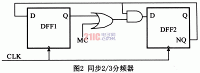 同步2/3分频器的结构框图如图2所示,它是整个分频器工作频率最高的部分,亦是决定前置分频器速度和功耗的关键部分。