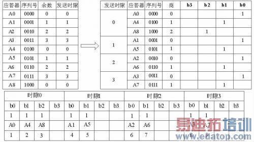 图3倒数第二行为9个标签的发送时序,发送的时序是A0,A4,A8,A1,A5,A2,A6,A3,A7.这样这9个标签就可以保证无碰撞地被读写器识别,这种多标签防碰撞冲突是多标签定位系统能够正常工作的前提。