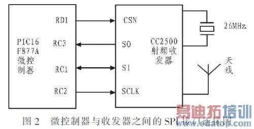 射频收发器选用CC2500作为控制芯片,CC2500集成了一个数据传输可达500 kbps的高度可配置的调制解调器,大大加强了数据传输的性能,同时通过开启集成在调制解调器上的前向误差校正选项,使性能得到大幅度提升。MCU通过SPI接口向CC2500发送操作命令,配置其调制方式、工作频率等参数,通过指令将其配置为接收状态、发送状态、空闲状态或休眠状态。CC2500的引脚SO和SI分别为数据传输的输出和输入信号线,CSN为片选信号引脚,SCLK为时钟信号引脚。当其接收到一个数据或发送完一个数据,都会通过引脚GD00和GD02输出相应的状态脉冲,MCU据此来判断CC2500的状态,从而决定对CC2500的下一步操控。微控制器PIC16F877A和CC2500收发器模块的连接如图2所示。