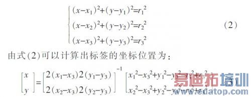 由式(1)中可以看出,射频参数A和n的值决定了接收信号强度和信号传输距离的关系。A和n用于描述通信操作环境。射频参数A被定义为dbm,表示距发射机1 m时接收到信号平均能量的绝对值,如平均接收能量是-10 dbm,那么参数A就被定义为10.射频参数n指出了信号能量随着到收发器距离增加而衰减的速率,其数值的大小取决于无线信号传播的环境。通过大量的比较和验证,得到实际应用场合环境因子EAF的大概值为13.5,A取45,n取3.5.依据式(1)可得到待定位标签到读写器的直线距离,r表示读写器与待定位标签之间的距离,即r=d.3个读写器的位置已知,分别是p1(x1,y1),p2(x2,y2),p3(x3,y3)。则待定位标签的坐标计算如式(2)所示: