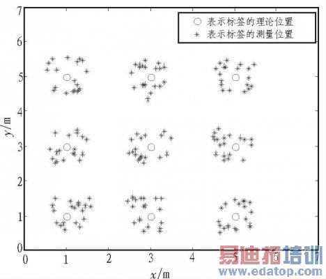 分别对每个标签到读写器的RSSI值测试20次,并记录其数据,通过上述圆周定位算法对得到的RSSI值进行处理,得到各个待定位标签的坐标值,实验结果如图7所示。