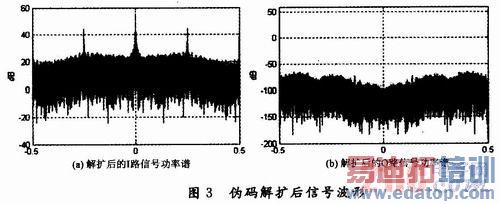 由图3可以看出,信号经过相关解扩处理后,有用信号被解扩,其功率谱集中于信息带宽内。而无用信号通过相关器后,频谱虽然大大的展宽了,但信号在整个频带内的能量不变。