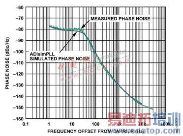 表1给出了该电路的设置,图2中显示的是测量结果与ADIsimPLL预测仿真性能的对比,可以看出结果非常吻合。测量的积分相位噪声为0.35 ps rms。测量设置如图3所示。