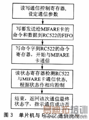 相对于PHILIPS公司生产的其他14443基站芯片(如RC500、RC530等),RC522简化了内部系统结构,去掉了片内E2PROM。从而大大缩减了芯片命令集。另外,对载波调制电路,发送电路和解调、解码电路的控制也相应简化,去掉了校准接收电路I时钟、Q时钟、校准发送与接收时钟相位等繁琐的操作。一般而言,单片机与RC522的通信流程如图3所示。