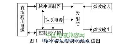 脉冲雷达发射机不管采用栅极调制方式还是阴极调制方式都工作在高压大电流的脉冲状态,一般由发射管、脉冲调制器、直流高压电源和控制保护等单元模