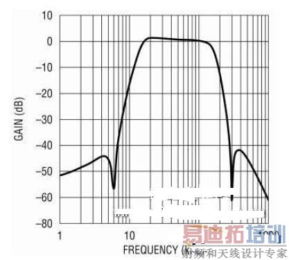 低通和高通转角频率以及滤波器带宽由频率频率的标度比设定。低通标度比选项为100、300和600,而高通标度比为1000、2000和6000.图一显示一个典型的滤波器回应,该滤波器具90MHz内部频率,高通和低通标度比分别设定为6000和600.4阶椭圆截止阻带响应有助于消除带外噪声。控制基频带宽就可以在RFID接收器适应工作环境的过程中,用软件定义它的工作模式。