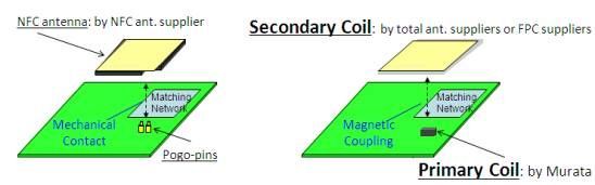 除此之外,村田突破了传统的NFC天线馈点通过pogo pin或者弹片等机械接触的方式与芯片相连的规矩,开发了无触点耦合式的接触,只需芯片级大小的初级线圈在PCB直接与NFC芯片相连,而次级线圈可以使用更薄的线圈,更灵活的方式放置在后壳或者其他部位。使NFC功能的实现又多了一个选择。