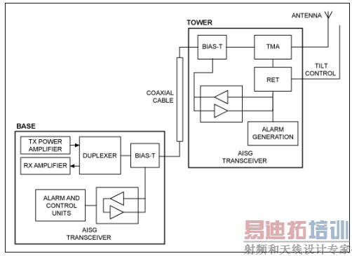 图2所示系统为符合AISG标准协议的基站系统架构,也可按照该协议传输报警信息。由于AISG数据为低频调制,可利用相同电缆来传输射频数据,处理AISG信号。这种多功能性降低了布线要求。此外,利用T型网络装置,还可能在同一同轴电缆上同时承载地面到塔台设备的供电电源(典型值为30V)。