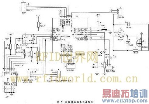 数据采集器佩戴在病人身上,主要完成对病人生理体征参数的采集、处理和存储等功能,由传感器电路、微处理器以及铁电存储器等部分组成。传感器包括温度传感器 DSl8820、HK-2000A型集成化脉搏传感器、HXB-2型压电呼吸传感器以及其他待扩展传感器,微处理器选用了PLILIPS公司的高速、低功耗、8位FLASH单片机LPC932,铁电存储器选用RAMTRON公司集成时钟电路的FM31256。数据采集器电气原理图如图2所示。