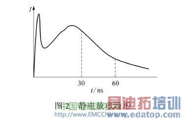 静电系由非常低的能量累积以电容模式储存在人体或设备表面,由突发触及使其储能以极大的速度崩溃放电而成,其频宽可由数百MHz到数GHz。其放电过程如图2所示。由图2可知,由于静电放电波形的上升沿时间很短,最小可达1 ns左右,电流的变化率很大,其峰值电流可达数十安培,其电磁辐射场可在附近导线上感应出数百伏乃至上千伏的电压,所以对电路的影响极大,特别是对CMOS器件,因为其氧化膜的耐压界限一般仅为100~150 V。