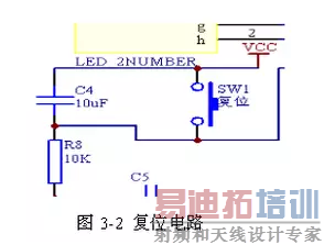 AT89S51的RST引脚为复位引脚,只要在RST引脚上出现两个机器周期以上的高电平,即可实现复位。本设计采用的是按键复位,如图3-2所示,当按下按键后,电容被短路,RST引脚就处于高电平,就可以达到复位的目的。