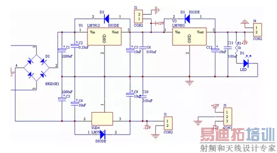本系统主要采用+-12V电源和+5V电源,电路图如图所示: