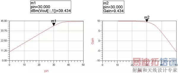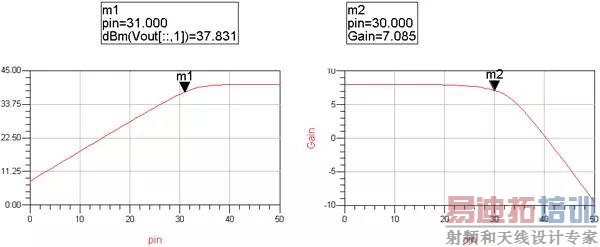 在小信号环境下,匹配电路的功率传输性能良好。将匹配电路接到功放管的输入输出端,在大信号功率激励下进行功率和增益扫描: