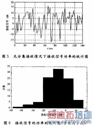 从图5可看出,固定步长功率控制算法在无分集接收情况下,接收信号有很强的“过冲”现象,这是由于系统根据上一时刻的接收信号的功率的强度来决定下一时刻的功率调整方向,而且每次的功率控制在系统出现深度衰落的时刻,就会无法即时补偿,而在控制误差很小时,将引起很大的波动。接收信号的功率的统计图如图6所示。