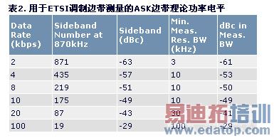 采用FCC所要求的峰值检波器或“Max Hold”设置时,鉴于以上三种因素的影响,会使测量功率增加多达10dB。因此,距离载波频率500kHz频点处的发射带宽测量频谱可能只比载波功率小20dB到25dB,尽管理论上调制谱要小35dB到55dB。由于理论频谱和测量频谱之间存在这一巨大差异,高数据速率的ASK发送器在进行FCC测试时可能出现问题。因为FCC要求考虑所有影响因素后,距离载波频率大约500kHz处的频谱要比载波波瓣功率小20dB。对应不同的数据速率,表1列出了距离载波频率500kHz处ASK调制边带的理论谱高度。同时也给出了采用100kHz、30kHz和10kHz带宽时测量的功率。