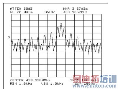 图3所示是MAX1472 ASK发送器采用4kHz方波(相当于8kbps的数据速率)调制时的频谱。可以看到,各旁瓣峰值均位于4kHz (即数据速率的一半)的奇数倍频点处。