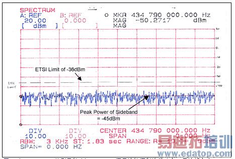 数据速率越低,越容易满足ETSI的限制要求。图6所示是用1.5kHz方波对433.92MHz、+10dBm的载波进行ASK调制时频谱分析仪的测量迹线,该结果是频谱分析仪在434.79MHz (零扫描)处用3kHz带宽测量得到的。这相当于3kbps的数据速率。该迹线的峰值幅度大约为-45dBm,相对于+10dBm载波为-55dBc。该结果与距离载波频率870kHz处的第581个调制边带的功率计算结果是一致的:相对于+10dBm为-65dBc (或-55dBm),因为采用峰值检波器,会在此基础上增加10dB。即使采用10kHz带宽,该调制也满足ETSI的限制要求。