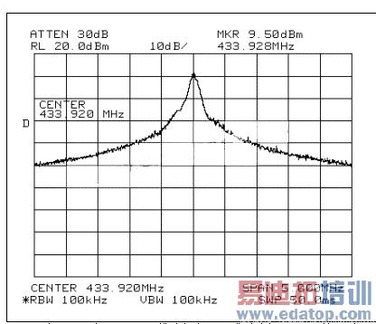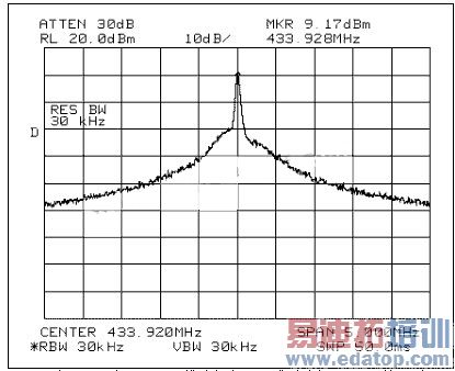 图4和图5分别示出了MAX1472 ASK发送器IC使用100kHz和30kHz测量带宽时的测量频谱,调制信号采用数据速率为19.2kbps的方波信号。计算出的功率电平和测量功率电平之间的差异是由相位噪声、VCO瞬态牵引和“峰值保持”测量技术造成的。使用30kHz的分辨带宽可以使功率测量值从-25dBc降至-30dBc,从而增加了满足发射带宽要求的裕度。