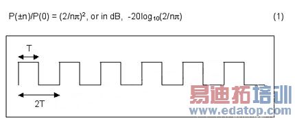 首先,将周期为2T的方波信号看作是数据速率为1/T的1010...不归零(NRZ)数据序列,如图1所示。该方波的功率谱如图2所示,其中零频率表示载波频率,f0。此时,f0由归一化的载波谱线和处于(1/2T)奇数倍频点的谱线组成。每条谱线的功率与载波(零频率)谱线的功率之比可由下式给出: