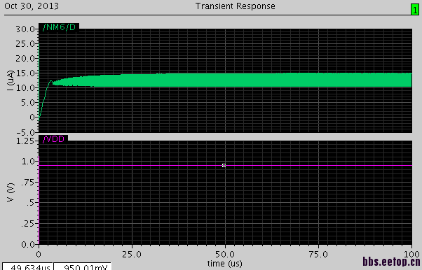 之前仿真时VDD一直用的DC源,换成Vpwl源(模拟上电过程)后输出的基准电流上会有很大的扰动,不知如何解决?各位的启动电路是如何设计的?