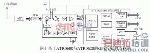 ATR0600射频前端为ATR0620提供卫星信号,主时钟信号和其它一些控制信号,而ATR0620为ATR0600提供采样信号。图4为利用ATR0600和ATR0620芯片设计的GPS接收机方框图。
