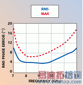 如图10所示,MMIC XS1000是一个7到13 GHz的6位移相器。器件LSB为5.625°(见图11),插入损耗为6.5 dB。在各种状态下它的输入输出回波损耗性能优秀,输入P1dB为 +25dBm。衰减误差小于1dB,RMS相位误差(见图12)小于3°。器件工作电压为7.5V,拥有6个控制输入端。所有器件提供了100%的晶片RF、DC检测和相位比特性能检测。该移相器目前只有冲模形式,2007年将推出封装器件。