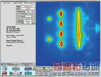 位于休斯敦的公司研究室使用热成像仪器在不同偏置条件下对XP1006进行了热成像(见图4)。与用模型进行热阻抗预测不同,这种成像仪使Mimix能够测量MMIC上所有器件的信道温度,从而利用这个图像可以实际的测量此MMIC的所有设备的信道温度,由此得到一个更准确的热阻值。只要热阻计算出来,可靠性信息例如平均故障发生时间(MTTF)和单位时间内故障(FIT)的就可以计算出来,并能得到更准确的安全工作最佳基本温度。公司的网站上有更详细的使用说明描述XP1006的应用。