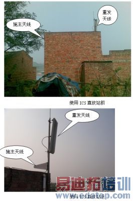 使用ICS直放站前,事主天线和重发天线距离较远,整机增益不能满增益90dB。使用ICS直放站后,施主天线和重发天线在同一根抱杆上,在隔离度比增益小15dB情况下也能正常最大增益工作。