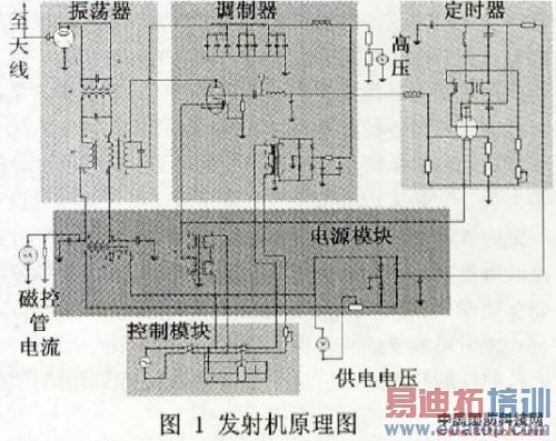 随着部队装备的升级换代,以及实验室仪器的自然淘汰,各实验室内都有大量的废旧装备。大型装备内部的部分元器件还是比较好的,还是有利用价值的,比如磁控管、闸流管等,虽然性能参数有所下降,但都不影响使用,而对于波导一类的高频器件,由于保管良好,性能参数都没有改变。以往这些装备(包括成批的备附件)都是按编制报废的。这些待报废的废旧装备和备附件为我们自主开发仪器提供了物质基础,我们就利用这些备品、备件,研制了实验用雷达发射机。现以所研制的实验用雷达发射机为例,介绍一下我们在实验教学方面所做的探索。
