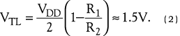 图1中的电路采用了一种基于施密特触发器和放大器电路的拓扑(IC1B和IC1C),从而解决了这个问题,它包括一个与频率有关的正反馈网络,由R1、R2、CD1和CD2构成。随着输入频率的不同,网络可表现出两种特性:在高频时,去耦电容器对CDC1和CDC2将反馈电阻器R1短路,从而抵消了由正反馈网络R1、R2与反相器IC1B的输入电容引起的时间常数。因此,在高频下,三个反相器IC1A、IC1B和IC1C表现为三个级联的高速放大器,可以实现最佳的输入信号带宽。在直流和低频时,耦合电容器对CD1和CD2的影响可以忽略不计,而反相器IC1B、IC1C与正反馈网络R1、R2可以起到一个施密特触发器电路的作用。为了对VS的输入灵敏度与确保比较器输出的无条件稳定之间做出折衷,要对施密特触发器输入VO1处的高、低阈值电压VTH和VTL做出选择。公式1和公式2分别设定高、低阈值电压: