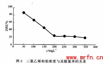 由图6可见,脱氯率随三氯乙烯初始浓度的提高呈下降趋势,在350mg/L浓度时仍有一定的脱氯率。实际上,被三氯乙烯污染的环境水体中,三氯乙烯总浓度一般在100mg/L左右,工业废水经初级处理后的三氯乙烯浓度也小于100mg/L。因此,在氯代烃可能出现的浓度范围内,该方法可达到理想的脱氯率。