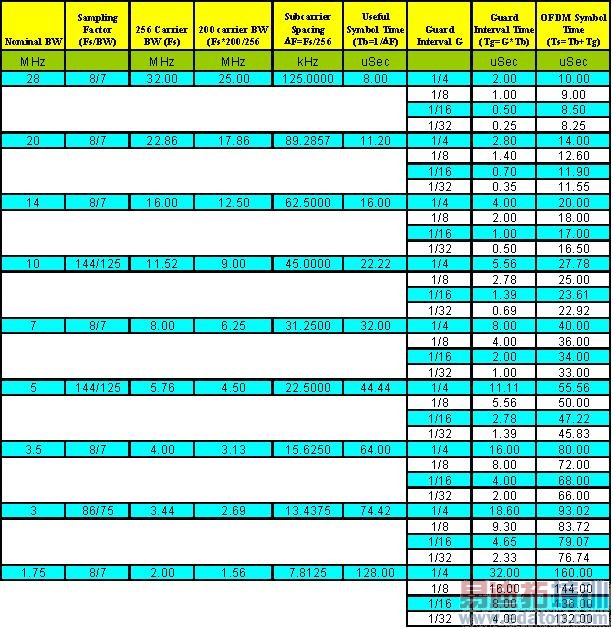 固定WiMAX标准(常常被误称为802.16d)基于正交频分复用(OFDM)技术,使用256个副载波。该标准支持1.75到28MHz范围内的多个信道带宽。由于副载波的数量是固定的、而信道带宽是可变的,故副载波的间距会因信道带宽的不同而变化。该标准支持大量不同的循环前缀(符号时间的1/32到1/4)。表2列出了256点OFDM的相关技术参数,由表中可以看出副载波间距范围为7.8kHz到125kHz之间,符号时间的变化范围则为8.25us到160us。该标准支持多种不同的调制方案,包括BPSK、QPSK、16QAM和6?QAM。在实际推行上,所采用的调制方案乃根据测得的信道载干比/载噪比(CINR)来选择的。较高级的调制方案,比如6?QAM,需要更好的CINR来使比特误码率(bit error rate, BER)处于可接受的范围内。