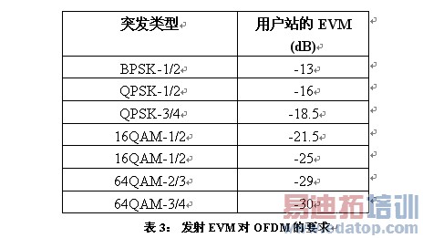 多项技术参数导致射频及参考设计充满挑战性,其中最困难的一项可能是发射误差向量幅值(EVM)。从表3可见,所需的发射EVM是调制的一个函数(在表中,调制类型后的分数后缀表示所用卷积编码中的凿孔程度)。在802.16标准的发展过程中,Tx EVM的获得使发射SNR较在10e-6 BER所需的接收SNR理论值低10dB,有效地消除了总体链路预算中的发射损伤。