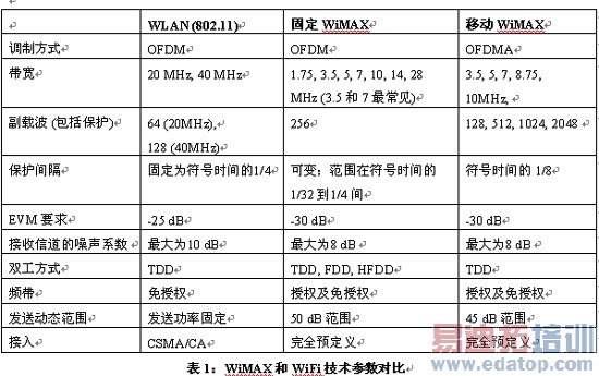 尽管有些人可能会把WiFi和WiMAX加以比较,因为二者都是基于OFDM的标准;但从射频角度来看,WiMAX 的实现要困难得多。表1对802.11以及802.16的两个变体作出了高层次的比较。