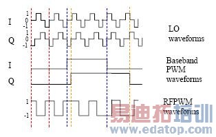 基带PWM同相、正交波形是分别生成的:内部引入四分之一相差来补充同相和正交本振信号之间的相差。研究基带PWM和RFPWM的定时波形,本振信号是三值格式,而组合输出RFPWM信号是二进制。此外,两个基带PWM都分别同步到其本振信号的上升沿。