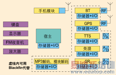 例如,单个Blackfin处理器可以同时执行以下应用功能:GPS定位管理、航向推测、从CD驱动器/闪存卡/HDD上播放MP3、CD驱动器数据的模块解码、通过单个或阵列麦克风来消除噪音和回声、语音识别、文本朗读、与本地手机的蓝牙连接等。在Blackfin CTP中,这些功能是由ADI的软件或预集成的第三方产品提供的。