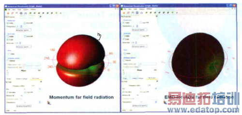 图6中比较了Momentum和EMDS预测的偶极子天线远场辐射图。由于EMDS在计算过程中不需要假设无限PCB介质平面的条件,所以其预测的远场图比矩量法技术预测的远场图更精确(矩量法仿真的结果显示了在假设的无限PCB平面方向上没有任何辐射)。