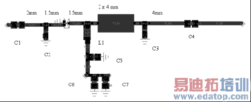 图2. 输入和输出匹配电路的设计图(0.4mm线路电阻为50Ω)