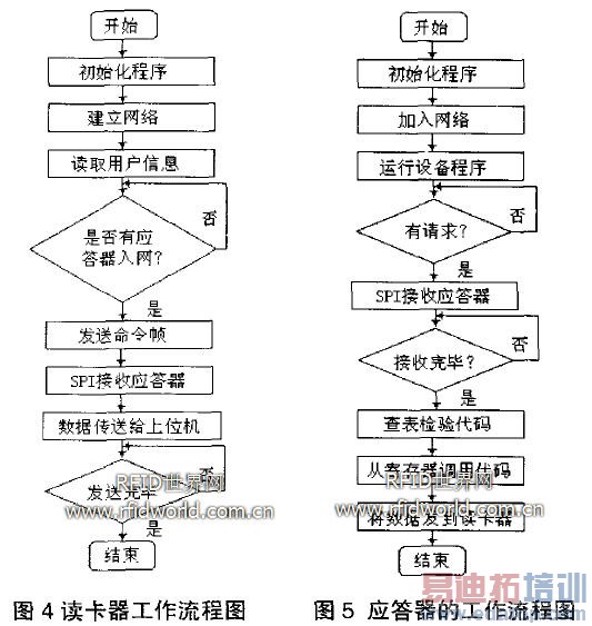 读卡器 是整个无线网络的管理员,它将负责网络的建立、地址的分配和成员的加入、节点设备数据的更新、设备关联表的维护并根据网络的状况自动更新。ZigBee网络要求至少一个FFD作为网络主节点。要建立一个网络,第一个节点必须被配置成主节点,这样才能管理以后添加到网络的其它节点。由于主节点处于网络的最上层,功能复杂,因此时主节点的硬件配置也有较高的要求,主节点一般是由电源供电。本课题中 读卡器 相当于整个网络的主节点,而应答器作为终端节点。一旦主设备将节点设备同网络连接,便可以实现通信。图4为在网络建立成功的基础上 读卡器 的工作流程图。