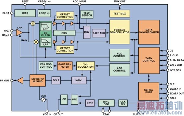 | 图1:短距离无线设备收发器ADF7020的结构框图。 |