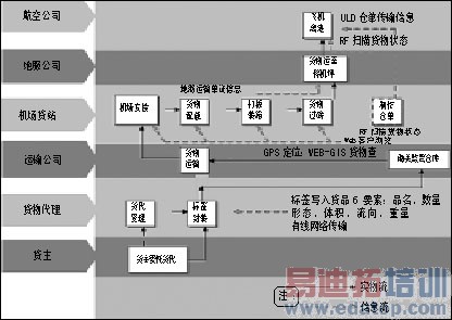 充分利用射频标签识别距离远、可多次读写、可同时识别多个物体、可动态读写的特点,以射频识别技术(RFID)为切入点,同时应用计算机网络通讯技术、电子数据交换技术(XML/EDI)、GPS-GIS定位与显示技术,结合C/S和B/S体系结构,建立机场物流信息综合管理系统,主要目标包括:单证与货物流程同步传输;实现对货物每个流程的信息实时跟踪查询,和实现机场航空物流无纸化管理。