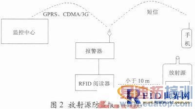 如果为每个辐射源安装有效距离小于10m的防拆毁RFID标签,并在离放射源不远处(如小于10m)安装RFID阅读器,那么,RFID阅读器将不断地读取RFID传来的数据。一旦RFID标签被拆毁,或辐射源被移动到距离RFID阅读器超过10m距离,RFID阅读器将不能再读取到该RFID的数据,此时就认为放射源被非法移动,报警器将自动通过短信方式向特定号码的手机发送报警信息,同时,通过GPRS或CDMA或3G网络,向监控中心发送报警信息。