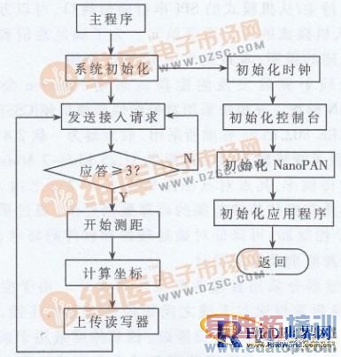 标签与读写器具有相同的软件结构,如图3所示。该系统采用Atmel公司的AVR Studio作为开发平台,平台采用C语言编程。在软件系统中,标签首先发送要求接人广播包的请求,等待读写器的响应,当收到3个以上(包含3个)读写器响应后,标签开始对收到的读写器进行测距,完成测距后根据读写器位置信息计算出自己的位置坐标并通过广播上传至读写器,开始新一轮测距。其程序流程图如图4所示。