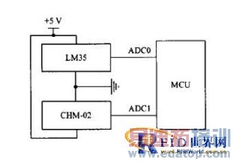 本系统采用温度传感器LM35和湿度测量模块CHM-02进行环境监测。LM35的电压输出与摄氏温度呈线性关系,无需校准就可在常温环境下达±l/4℃的测量精度。CHM-02模块可在0~70 ℃的温度下对20~95%RH范围内的湿度进行检测,室温下的测量精度为5%RH.温湿度传感器与MCU的接口示意图如图4所示。由于两种传感器输出的模拟信号在MCU片内A/D采样电路的检测范围内,所以直接将两者的输出端与MCU的两个ADC引脚连接。模拟式传感器的使用不但充分利用了控制器的片上资源,而且提高了子程序的利用率。