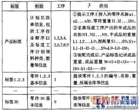在生产线工位供货环节中,生产物流部门将零部件送达工位之后,MES系统更新零部件数量信息及工序信息。完工后,高频读写器读取产品标签,系统检查产品经过的各道工序、料耗等装配信息,并以生产料耗表的形式呈现给装配车间主任、成本分析员、工资核算员。最后,工作人员取下产品RFI标签,循环使用。图5中。各标签采集的数据如表2所示。