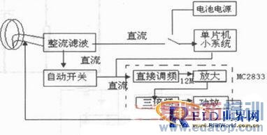 应答器主要由整流滤波电路、自动开关、发射电路和单片机小系统组成,其原理框图如图3所示。