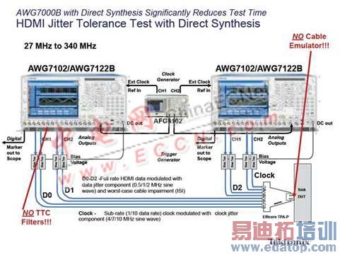 图2:泰克独一无二的AWG7000B直接合成方案可替换和省去所有类型的线缆仿真器和多达40个TTC滤波器,大幅降低HDMI接收端抖动容限测试的复杂度,并有效降低成本。