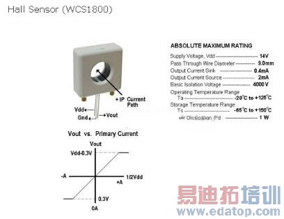 透过WCS1800将感应到的交流电流转变为输出电压(Vout),而输出电压(Vout)组成成分是包含(Vac)交流电压讯号和(Vdc)直流电压讯号混和而成的讯号,使用HY16F198量测输出电压(Vout)讯号,并且透过算法分析ADC Count数值,进而换算出相对感测到的交流电流负载。但需注意,透过Hall Sensor(WCS1800)转出每1安培(A)的输出电压最大误差为正负6mV,详细的Hall Sensor特性规格表显示在下一页电器特性表。