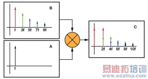 图5.如果输入信号(A)和参考信号(B)都是方波,则将它们相乘(C)可有效解调输入信号的每个谐波。