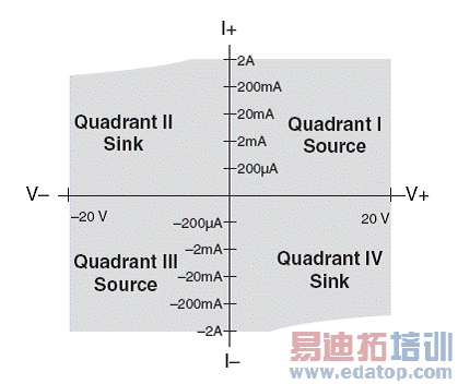 图2. NI PXI-4130 Power SMU通道1的象限图 双极 对于归类为4-象限的电源或SMU而言,它必须具备在同一端口提供正电压和负电压的能力。这对描述同时具有正向和反向特性的有源设备中的击穿现象是非常重要的。你可以采用一个输出通道来提供从负到正的扫描电压,以表征这些正向和反向特性。PXI-4130功率SMU在它的两极SMU通道上提供了+20 V到-20 V的电压输出。